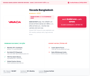 ২০২৬ সালের পূর্ণাঙ্গ ভাভাদা (Vavada) ক্যাসিনো রিভিউ। রেজিস্ট্রেশন করলেই ১০০ ফ্রি স্পিন এবং কোনো আইডি ভেরিফিকেশন ছাড়াই দ্রুত টাকা তোলার পদ্ধতি জানুন।
