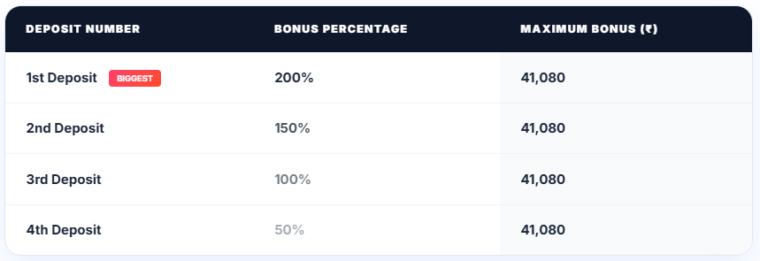 এই বোনাসটি আপনার প্রথম চারটি ডিপোজিটে ধাপে ধাপে প্রদান করা হয়: