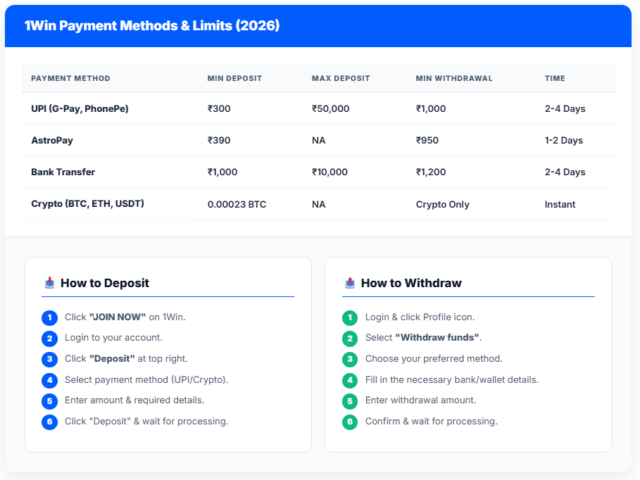 দ্রষ্টব্য: যদিও ১উইন একটি ইউজার-ফ্রেন্ডলি প্ল্যাটফর্ম, তবে বিকাশ বা নগদের মতো কিছু লোকাল গেটওয়েতে ডিপোজিট লিমিট কিছুটা কম হতে পারে। বড় লেনদেনের জন্য AstroPay বা ক্রিপ্টো ব্যবহার করা সেরা বিকল্প।