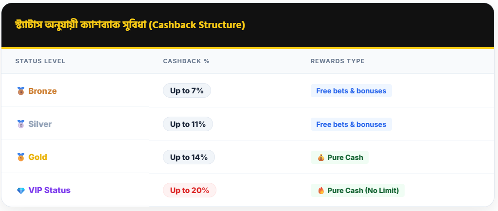 - ক্যাশব্যাক সুবিধা: আপনি যদি কোনো বাজিতে হেরেও যান, আপনার স্ট্যাটাস লেভেল অনুযায়ী একটি নির্দিষ্ট শতাংশ টাকা ক্যাশব্যাক হিসেবে আপনার অ্যাকাউন্টে ফেরত আসবে।