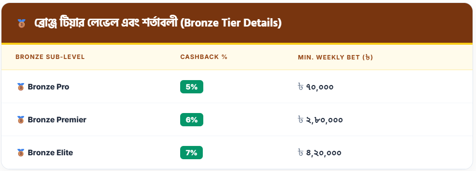 - সাপ্তাহিক বাজির শর্ত: ব্রোঞ্জ প্রো (Bronze Pro) লেভেল থেকে উচ্চতর ধাপে যেতে হলে সাপ্তাহিক নির্দিষ্ট পরিমাণ বাজি ধরার প্রয়োজন হয় (যেমন- ৫০,০০০ BDT/INR থেকে শুরু)।