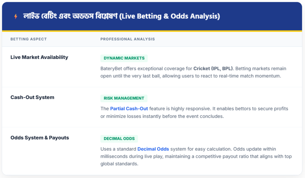 ক্রিকেট বেটিং সেকশন: ক্রিকেট প্রেমীদের জন্য ব্যাটারিবেট একটি বিশেষ আকর্ষণ। এখানে বড় বড় টুর্নামেন্ট এবং আন্তর্জাতিক ম্যাচগুলোর জন্য অত্যন্ত প্রতিযোগিতামূলক অডস (Competitive Odds) পাওয়া যায়।