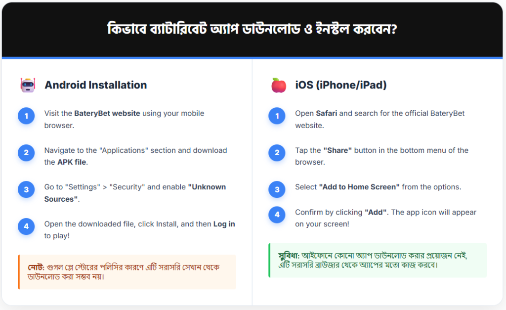 গুগল প্লে-স্টোরের নীতিমালার কারণে আপনি অ্যাপটি সরাসরি সেখান থেকে পাবেন না। তবে নিচের সহজ ধাপগুলো অনুসরণ করে আপনি এটি ইনস্টল করতে পারেন: ১. আপনার স্মার্টফোন থেকে BateryBet অফিসিয়াল ওয়েবসাইটে যান। ২. “Applications” সেকশনটি খুঁজে বের করুন এবং অ্যান্ড্রয়েড ইনস্টলেশন ফাইলটি (APK) ডাউনলোড করুন। ৩. আপনার ফোনের Settings-এ যান এবং “Unknown Sources” থেকে অ্যাপ ইনস্টল করার অনুমতি দিন। ৪. ডাউনলোড করা ফাইলটি ওপেন করুন এবং ইনস্টল সম্পন্ন হওয়া পর্যন্ত অপেক্ষা করুন। এরপর লগইন করে খেলা শুরু করুন!