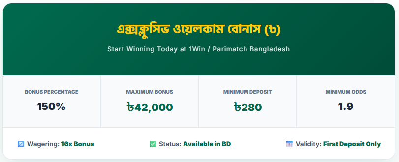 পারিম্যাচ (Parimatch) নতুন বেটরদের জন্য বাজারের অন্যতম সেরা স্পোর্টস ওয়েলকাম বোনাস অফার করে। আপনি যখনই আপনার প্রথম ডিপোজিট সম্পন্ন করবেন, এই বোনাসটি আপনার অ্যাকাউন্টে স্বয়ংক্রিয়ভাবে (Automatically) জমা হয়ে যাবে। অন্যান্য স্পোর্টসবুকের তুলনায় পারিম্যাচের ওয়েলকাম বোনাসটি এর সহজ শর্ত এবং ন্যূনতম অডস (Odds) রিকোয়ারমেন্টের জন্য দক্ষিণ এশিয়ার বাজারে অত্যন্ত জনপ্রিয়।