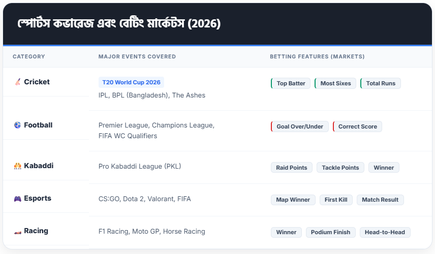 ক্রিকেট বেটিং – ২০২৬ সালের বিশেষ আকর্ষণ: পারিম্যাচ টেস্ট, ওডিআই (ODI) এবং টি-টোয়েন্টি—সব ফরম্যাটেই বাজি ধরার সুযোগ দেয়। বিশেষ করে ২০২৬ সালের আইসিসি টি-টোয়েন্টি বিশ্বকাপ (যা ভারত ও শ্রীলঙ্কায় অনুষ্ঠিত হবে), আইপিএল এবং বিপিএল-এর জন্য এখানে রয়েছে বিশেষ সব মার্কেট।
