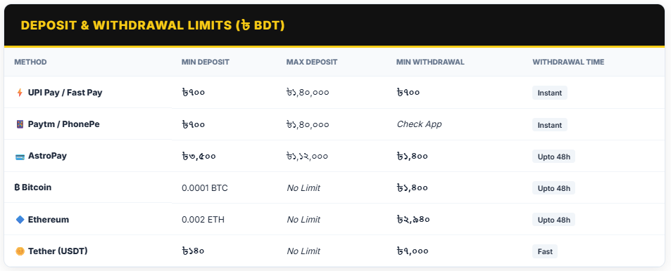 - উইথড্রয়াল টাইম: বেশিরভাগ ক্ষেত্রে পেমেন্ট তাৎক্ষণিক হলেও কিছু মেথডে ৪৮ ঘণ্টা পর্যন্ত সময় লাগতে পারে।