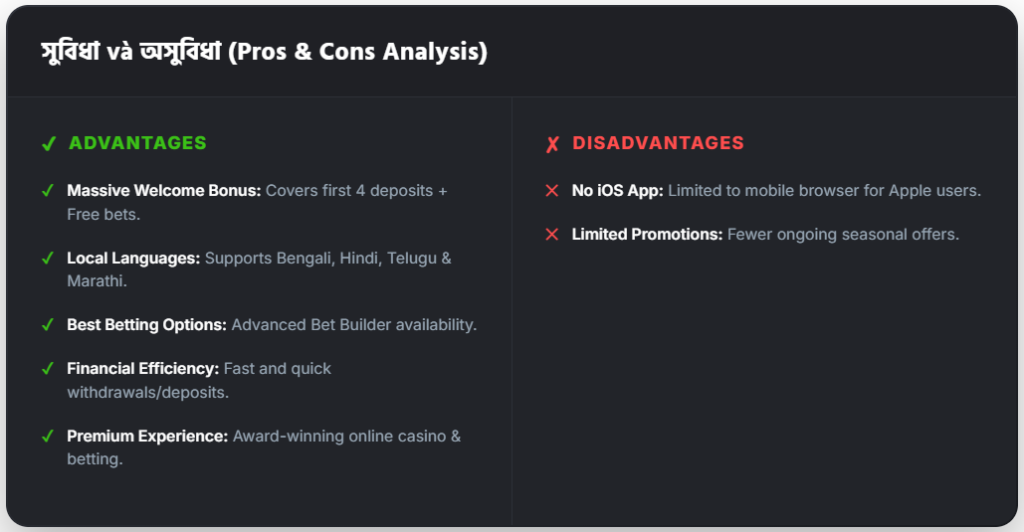 যেকোনো প্ল্যাটফর্মে বাজি ধরার আগে তার ভালো এবং মন্দ উভয় দিক জেনে নেওয়া জরুরি। বিসি.গেম (BC.Game) একটি অ্যাওয়ার্ড-উইনিং প্ল্যাটফর্ম হলেও এর কিছু সীমাবদ্ধতা রয়েছে। নিচে বিস্তারিত আলোচনা করা হলো:
