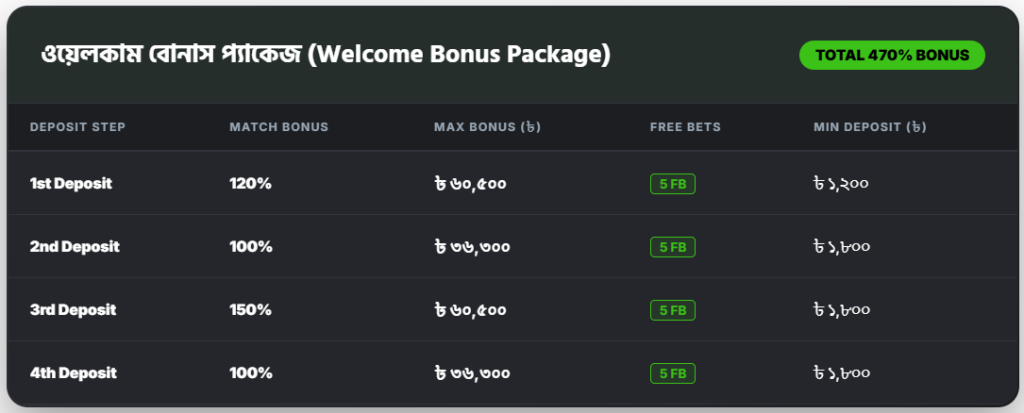 - বিশাল ওয়েলকাম প্যাকেজ: প্রথম ৪টি ডিপোজিটে ব্যবহারকারীরা ৪৭০% পর্যন্ত বোনাস পেতে পারেন। এর সাথে ২০টি পর্যন্ত ফ্রি স্পোর্টস বেট (Free Bets) দেওয়া হয়।