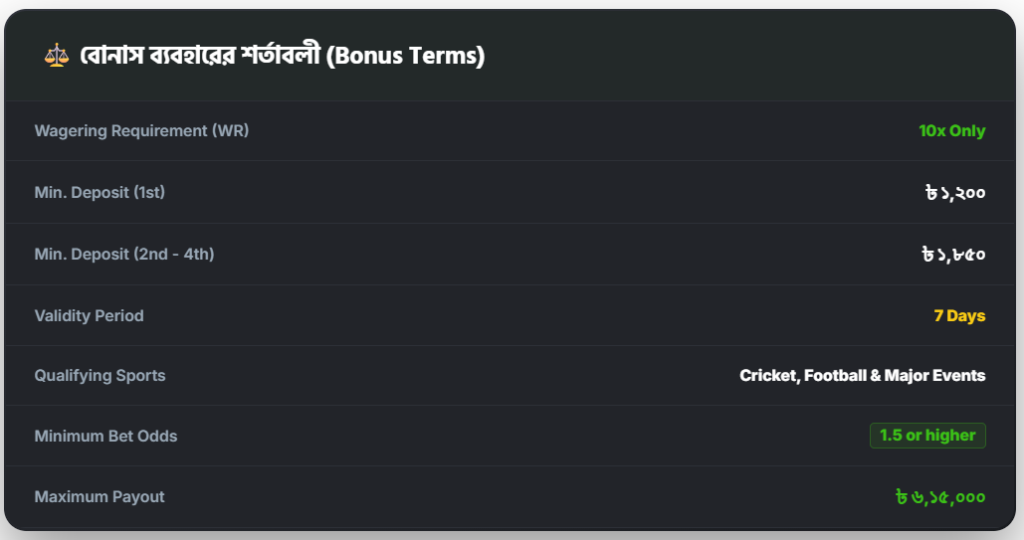 - বাজি ধরার শর্ত (Wagering): বোনাস অ্যামাউন্টের ওপর ১০ গুণ (10x) বাজি ধরতে হবে।