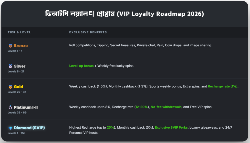 - ফ্রি উইথড্রয়াল: উচ্চ পর্যায়ের ভিআইপি মেম্বারদের জন্য কোনো ফি ছাড়াই টাকা তোলার সুবিধা রয়েছে।