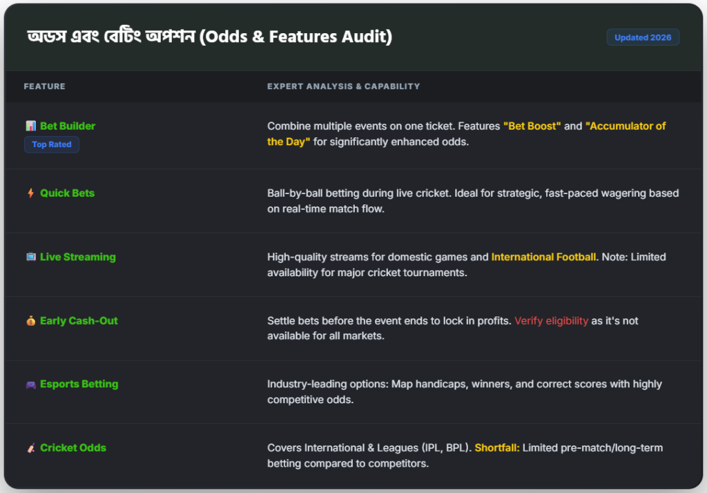 - বেট বিল্ডার ও একুমুলেটর: একটি টিকিটেই একাধিক ইভেন্ট যোগ করে বড় জয়ের সুযোগ। এছাড়া ‘Accumulator of the Day’ ফিচারে বাড়তি অডস পাওয়া যায়।