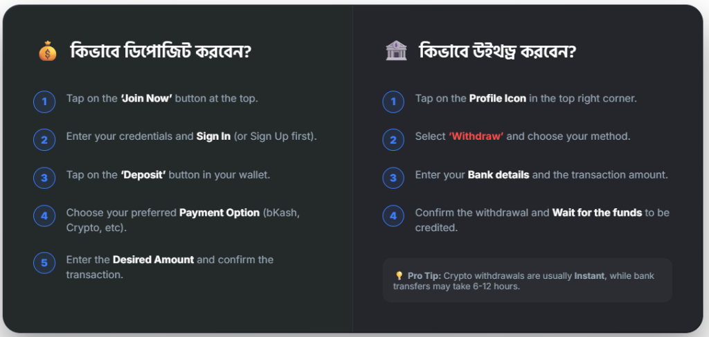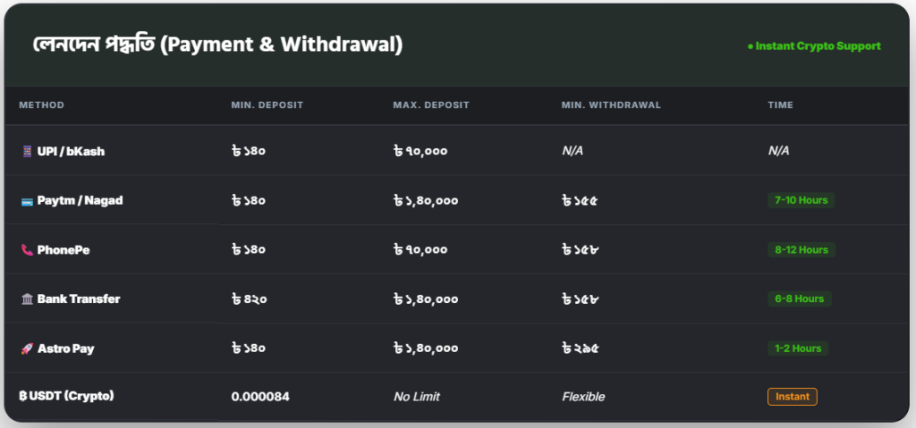 | Deposit Methods | bKash, Nagad, Crypto, UPI |