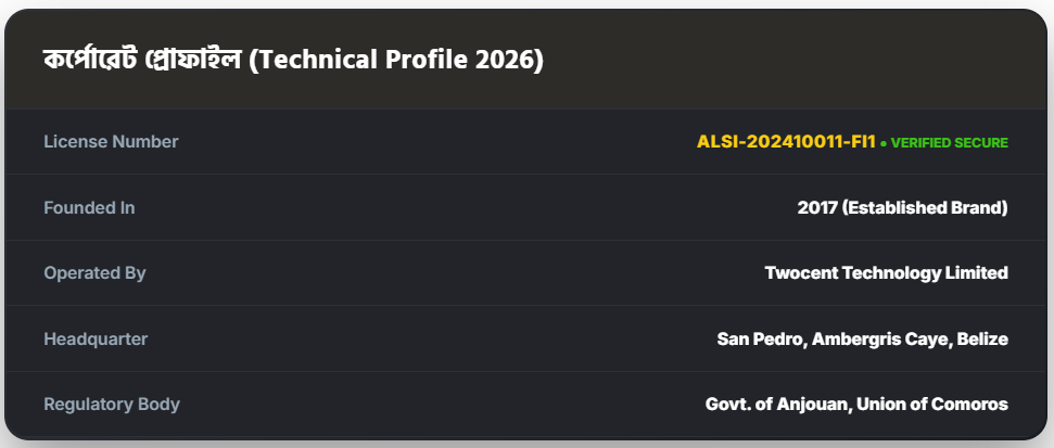 - স্বচ্ছতা ও বৈধতা: ২০১৭ সালে প্রতিষ্ঠিত এই প্ল্যাটফর্মটি Twocent Technology Limited দ্বারা পরিচালিত এবং এর সদর দপ্তর কিউরাসাওতে অবস্থিত।