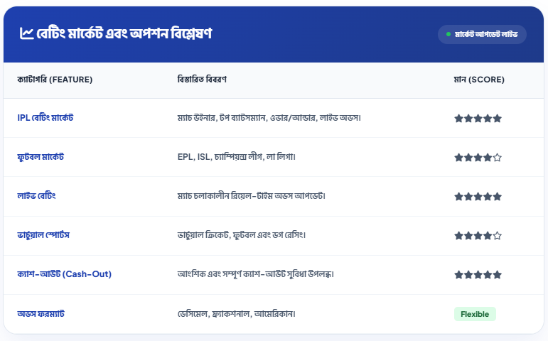 - সেরা ক্রিকেট অডস: আইপিএল (IPL) এবং আন্তর্জাতিক ক্রিকেটে অন্য যেকোনো সাইটের চেয়ে ভালো অডস পাওয়া যায়।
