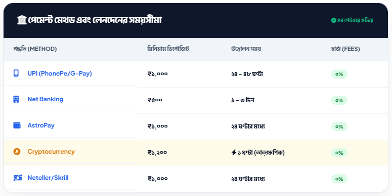 - দ্রুত উইথড্রয়াল: ই-ওয়ালেট এবং ক্রিপ্টোর মাধ্যমে সাধারণত ২৪ ঘণ্টার মধ্যে টাকা পাওয়া যায়। তবে ব্যাংক ট্রান্সফারে ১-৩ কার্যদিবস লাগতে পারে।