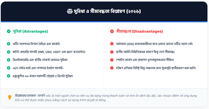 - ভাষার অভাব: ওয়েবসাইট বা ক্যাসিনো অ্যাপে কোনো স্থানীয় ভারতীয় বা বাংলাদেশি ভাষার পূর্ণাঙ্গ সাপোর্ট নেই, যা স্থানীয় বাজারের প্রতি তাদের কিছুটা কম মনোযোগের পরিচয় দেয়।