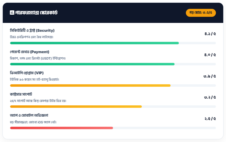 ৯৬.কম (96.COM) প্ল্যাটফর্মটিকে আমাদের বিশেষজ্ঞরা বিভিন্ন মানদণ্ডে যাচাই করেছেন। সামগ্রিকভাবে, এটি একটি নির্ভরযোগ্য সাইট হলেও কিছু ক্ষেত্রে উন্নতির প্রয়োজন রয়েছে। বিশেষ করে তাদের নিরাপত্তা ব্যবস্থা এবং পেমেন্ট পদ্ধতি অত্যন্ত উন্নত, তবে মোবাইল অ্যাপের অভিজ্ঞতা ব্যবহারকারীদের কিছুটা হতাশ করতে পারে।