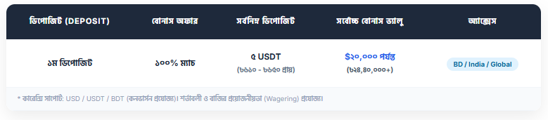 - ন্যূনতম জমা: বোনাসটি সক্রিয় করতে আপনাকে অন্তত ৫ USDT (প্রায় ৬০০-৬৫০ টাকা) জমা দিতে হবে।