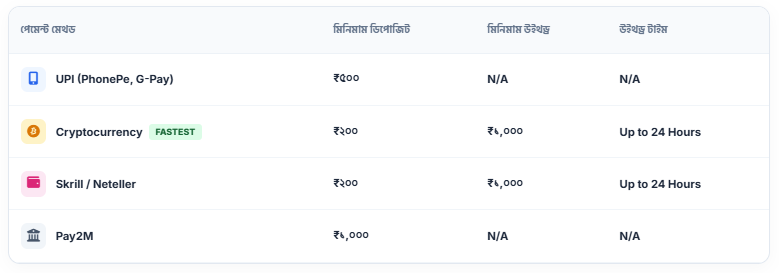 ৯৬.কম ভারতে কোন কোন পেমেন্ট পদ্ধতি সমর্থন করে? এটি ইউপিআই (UPI – Paytm, PhonePe, GPay), নেট ব্যাঙ্কিং, স্ক্রিল, নেটেলার এবং বিভিন্ন ক্রিপ্টোকারেন্সি (USDT, BTC, ETH) সমর্থন করে।