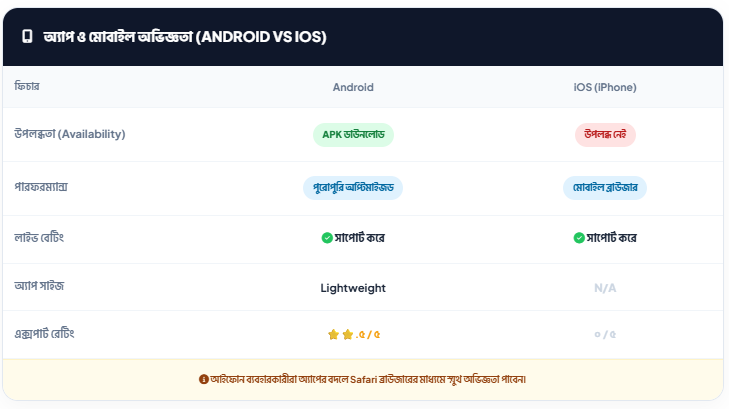 ৯৬.কম (96.COM) বর্তমানে শুধুমাত্র অ্যান্ড্রয়েড (Android) ব্যবহারকারীদের জন্য মোবাইল অ্যাপ সুবিধা প্রদান করছে। আইফোন (iOS) ব্যবহারকারীদের জন্য বর্তমানে কোনো অফিশিয়াল অ্যাপ নেই, যা এই প্ল্যাটফর্মের একটি বড় সীমাবদ্ধতা। তবে তাদের অ্যান্ড্রয়েড অ্যাপটি অত্যন্ত দ্রুত, ইউজার-ফ্রেন্ডলি এবং ওয়েবসাইটের মতোই সব ফিচার সমৃদ্ধ।