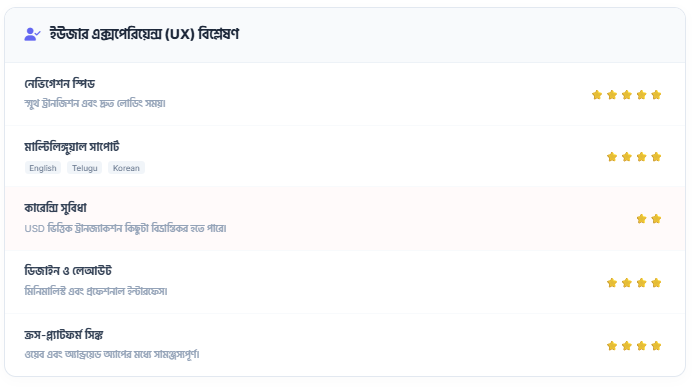 - মাল্টি-কারেন্সি সাপোর্ট: বিডিটি (BDT), রুপি (INR), ডলার (USD) এবং ইউএসডিটি (USDT) সমর্থন করে।