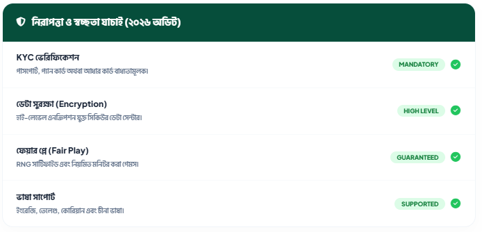 - KYC ভেরিফিকেশন: জালিয়াতি রোধে এবং আসল খেলোয়াড় নিশ্চিত করতে এখানে আইডি ভেরিফিকেশন বাধ্যতামূলক।