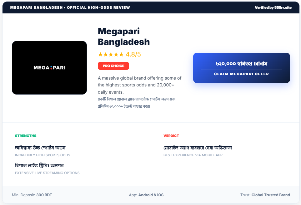মেগাপারি (Megapari) ২০১৯ সালে প্রতিষ্ঠিত হলেও খুব অল্প সময়ে এটি ১এক্সবেট (1xBet) এবং ১উইন (1win)-এর প্রধান প্রতিদ্বন্দ্বী হয়ে উঠেছে। আপনি যদি এমন একটি প্ল্যাটফর্ম খোঁজেন যেখানে ক্রিকেটের পাশাপাশি কাবাডি, ফুটবল এবং ঘোড়দৌড়ের জন্য সবচেয়ে বেশি মার্কেট পাওয়া যায়, তবে মেগাপারি আপনার সেরা গন্তব্য। এখানে প্রতিদিন ১,০০০-এর বেশি স্পোর্টস ইভেন্টে বাজি ধরার সুযোগ থাকে।