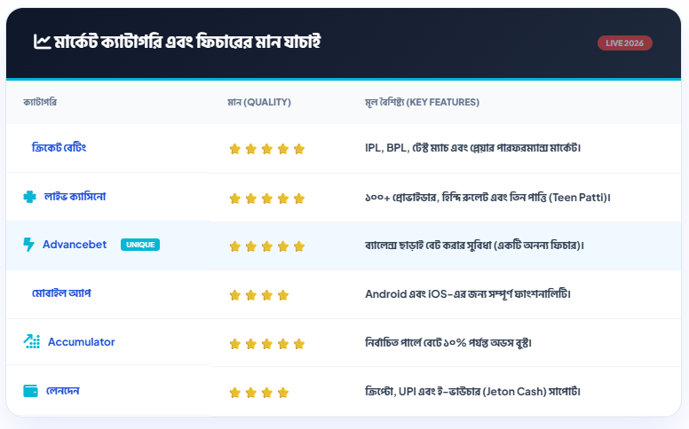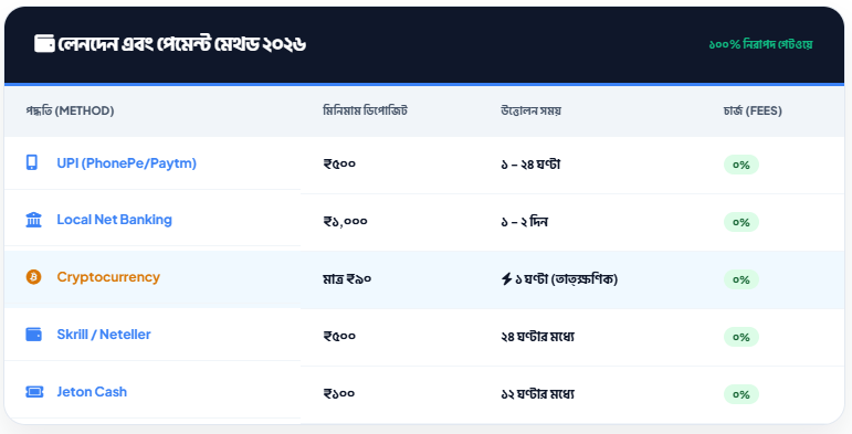 | পেমেন্ট মেথড | UPI, NetBanking, Crypto, Jeton (৫০+ অপশন) |