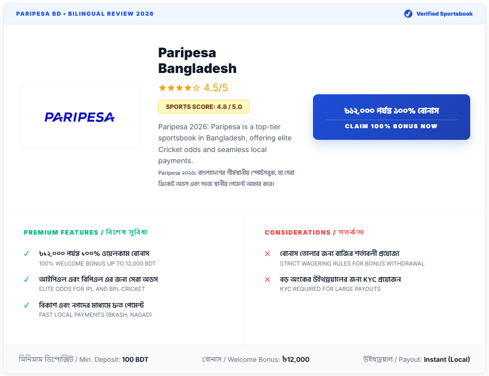 ভারতীয় এবং বাংলাদেশি খেলোয়াড়দের জন্য পারিপেসা একটি আকর্ষণীয় প্ল্যাটফর্ম কারণ এখানে স্থানীয় পেমেন্ট পদ্ধতি যেমন UPI, bKash এবং Nagad ব্যবহার করা যায়। তবে, তাদের কাস্টমার সার্ভিসের সীমাবদ্ধতা সম্পর্কে আগে থেকেই জেনে নেওয়া ভালো।