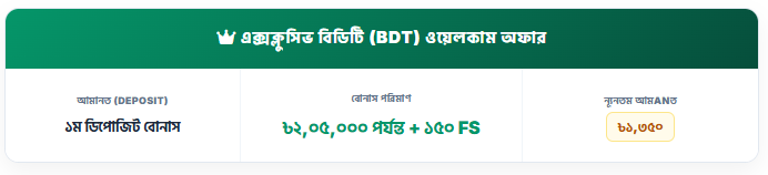 কিভাবে বোনাসটি দাবি করবেন? নতুন ইউজার হিসেবে জয়েন করার সময় প্রোমো কোড CBPFB550 ব্যবহার করুন। আপনার প্রথম জমার (Deposit) ওপর ভিত্তি করে আপনি ১,৪৫,০০০ টাকা পর্যন্ত বোনাস এবং ১৫০টি ফ্রি স্পিন পেতে পারেন।