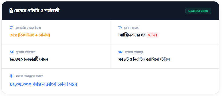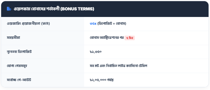 - বাজি ধরার প্রয়োজনীয়তা (Wagering): আপনাকে বোনাস এবং জমার টাকা মোট ৩৫ বার (35x) বাজি ধরতে হবে।