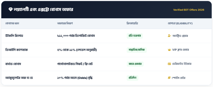 - উইকলি রিলোড বোনাস (Weekly Reload): প্রতি সপ্তাহে নির্দিষ্ট দিনে ডিপোজিট করলে আপনি অতিরিক্ত বোনাস পাবেন যা আপনার খেলার সময় বাড়িয়ে দেবে।