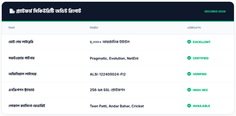 - আরএনজি (RNG) সার্টিফাইড: এখানকার সব গেম ‘র্যান্ডম নম্বর জেনারেটর’ প্রযুক্তি ব্যবহার করে, যা নিশ্চিত করে যে প্রতিটি খেলার ফলাফল সম্পূর্ণ নিরপেক্ষ এবং কেউ এটি নিয়ন্ত্রণ করতে পারে না।