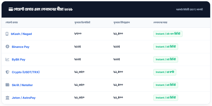 - নিরাপদ পেমেন্ট গেটওয়ে: বিকাশ (bKash), নগদ (Nagad) এবং ক্রিপ্টোকারেন্সির মাধ্যমে নিরাপদ লেনদেনের নিশ্চয়তা।