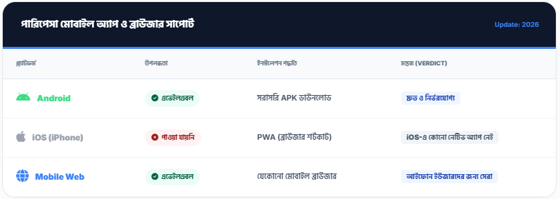 ২০২৬ সালে এসেও পারিপেসা (Paripesa) তাদের মোবাইল অ্যাপের ক্ষেত্রে কিছুটা পিছিয়ে রয়েছে। অ্যান্ড্রয়েড ব্যবহারকারীদের জন্য অ্যাপ থাকলেও, আইফোন (iOS) ব্যবহারকারীদের জন্য কোনো অফিসিয়াল অ্যাপ নেই—যদিও তারা দাবি করে। এই সীমাবদ্ধতার কারণে আমরা একে ৫-এর মধ্যে মাত্র ৩ রেটিং দিচ্ছি।