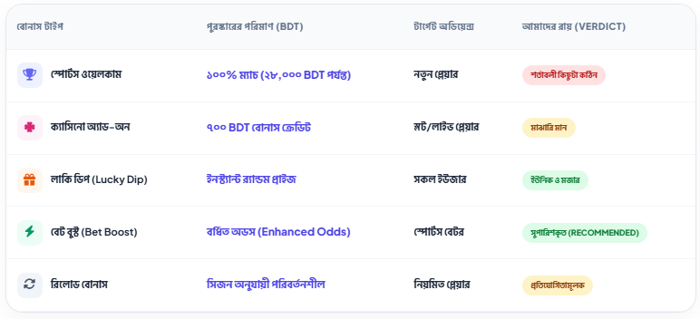 উইকলি স্পোর্টস বুস্ট (Weekly Sports Boost): প্রতি সপ্তাহে নির্দিষ্ট কিছু খেলার ওপর বাড়তি অডস এবং বোনাস সুবিধা।