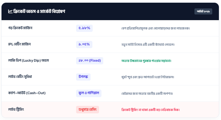 লাইভ স্ট্রিমিং সীমাবদ্ধতা: বর্তমানে এখানে শুধুমাত্র ঘোড়দৌড় (Horse Racing) লাইভ দেখা যায়, ক্রিকেটের সরাসরি সম্প্রচার নেই।