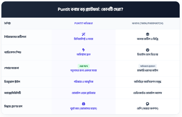 পানটিট (Puntit) বর্তমানে ভারতের বাজারে নতুন হওয়ায় পরিম্যাচ (Parimatch) বা ১উইন (1win)-এর মতো প্ল্যাটফর্মগুলোর তুলনায় এখানে খেলোয়াড় সংখ্যা কিছুটা কম। তবে এটি সেইসব বেটরদের জন্য আদর্শ যারা খুব বেশি অপশন দেখে বিভ্রান্ত হতে চান না। পানটিট-এর মূল লক্ষ্য হলো বেটিং প্রক্রিয়াকে সহজ রাখা।