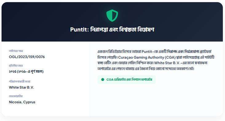 একজন রিভিউয়ার হিসেবে আমরা পানটিট (Puntit)-কে ভারতীয় এবং বাংলাদেশি ব্যবহারকারীদের জন্য একটি অত্যন্ত নিরাপদ এবং নির্ভরযোগ্য প্ল্যাটফর্ম হিসেবে পেয়েছি। সাইটটি Curaçao Gaming Control Board (CGCB) দ্বারা লাইসেন্সপ্রাপ্ত এবং নিয়ন্ত্রিত (লাইসেন্স নম্বর: OGL/2023/159/0076)। এটি খেলোয়াড়দের জন্য স্বচ্ছ বেটিং এবং ক্যাসিনো গেমসের নিশ্চয়তা দেয়।