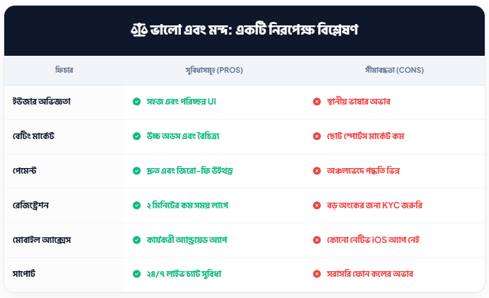 উইন-উইন (Win-win) প্ল্যাটফর্মটি ব্যবহারের আগে এর ইতিবাচক এবং নেতিবাচক দিকগুলো জেনে নেওয়া জরুরি। CRICKETBETBD-এর পাঠকদের জন্য আমরা এর একটি নিরপেক্ষ বিশ্লেষণ নিচে তুলে ধরলাম: