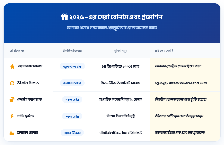 | বৃহস্পতিবার বোনাস | ১০০% (₹৯২৬৬ পর্যন্ত) | ₹৯৩ | বৃহস্পতিবার অন্তত ৯৩ রুপি জমা করলে ১০০% বোনাস সুবিধা পাওয়া যায়। |