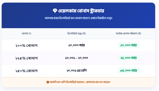 - ওয়েলকাম বোনাস (Welcome Bonus): নতুন ইউজারদের জন্য তাদের প্রথম ডিপোজিটে একটি বিশাল বোনাস দেওয়া হয়।