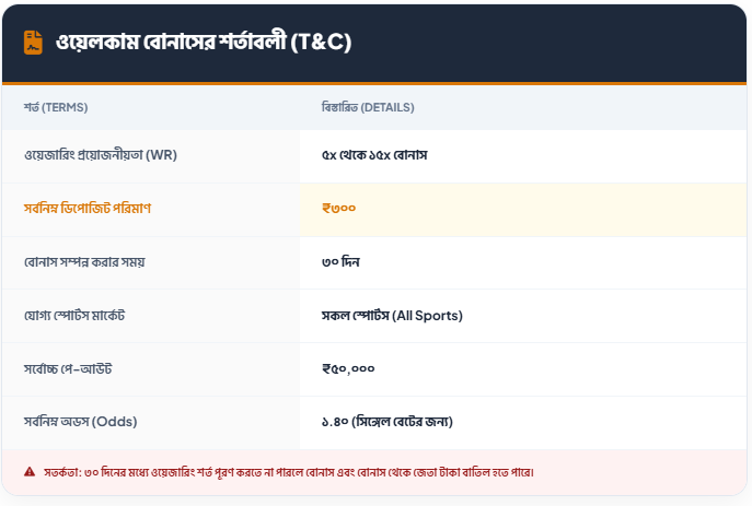 - ন্যূনতম ডিপোজিট: বোনাস সক্রিয় করতে আপনাকে কমপক্ষে ৩০০ টাকা (₹300) জমা দিতে হবে।