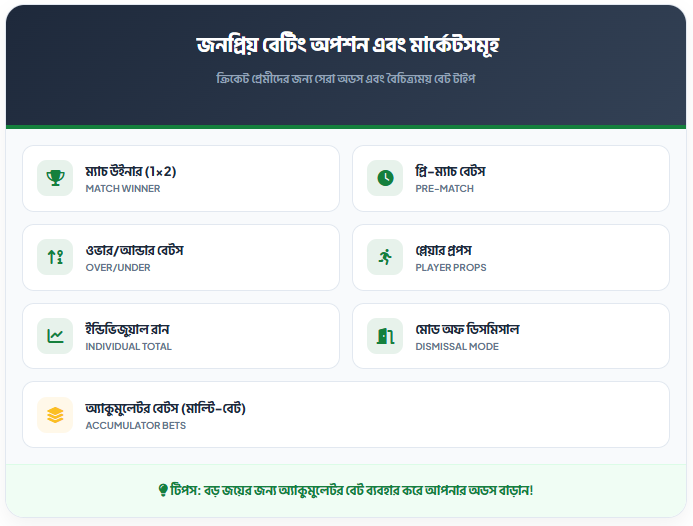 জনপ্রিয় বেটিং টাইপ: কে টস জিতবে (Toss winner), টিমের মোট রান (Team total runs), ড্র (Draw), এবং কোনো ওভারে উইকেট পড়বে কি না—এমন আরও অনেক অপশন এখানে পাওয়া যায়।