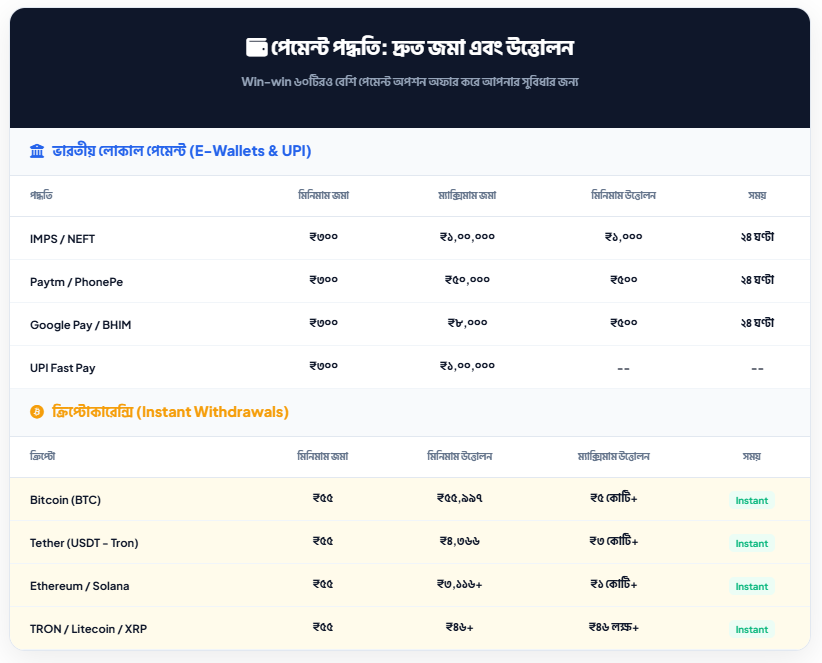 উইন-উইন (Win-win) ভারতীয় এবং বাংলাদেশি খেলোয়াড়দের জন্য একটি অবিশ্বাস্য পেমেন্ট সিস্টেম অফার করে। এখানে জমা দেওয়ার জন্য ৬০টি এবং টাকা তোলার জন্য ৪৭টি ভিন্ন পদ্ধতি রয়েছে। আপনি আপনার সুবিধামতো UPI, ই-ওয়ালেট বা ক্রিপ্টোকারেন্সি ব্যবহার করতে পারেন।