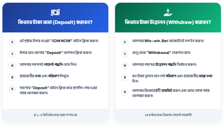 প্রশ্ন ৫: উইন-উইন থেকে টাকা তুলতে কত সময় লাগে? পেমেন্ট পদ্ধতির ওপর ভিত্তি করে সময় ভিন্ন হতে পারে। ক্রিপ্টোকারেন্সির মাধ্যমে টাকা তোলা হয় তাত্ক্ষণিক (Instant), আর ই-ওয়ালেট বা ব্যাংকের ক্ষেত্রে সাধারণত কয়েক ঘণ্টা থেকে ২৪ ঘণ্টা সময় লাগতে পারে।