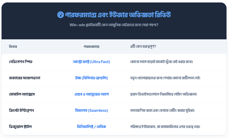 উইন-উইন (Win-win) ওয়েবসাইটের ইউজার এক্সপেরিয়েন্স মূলত তাদের সহজ এবং দ্রুত নেভিগেশনের ওপর ভিত্তি করে তৈরি। যারা খুব বেশি জটিলতা পছন্দ করেন না, তাদের জন্য এই সাইটটি সেরা। নতুন এবং অভিজ্ঞ—উভয় ধরণের বেটররাই এখানে খুব সহজে তাদের পছন্দের স্পোর্টস বা ক্যাসিনো গেম খুঁজে পাবেন।
