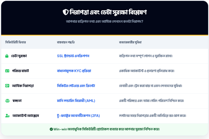 উইন-উইন (Win-win) তাদের প্ল্যাটফর্মে ব্যবহারকারীদের নিরাপত্তার ওপর সর্বোচ্চ গুরুত্ব দেয়। আপনি যখন এখানে লেনদেন বা বাজি ধরবেন, তখন আপনার তথ্য সম্পূর্ণ নিরাপদ থাকে।