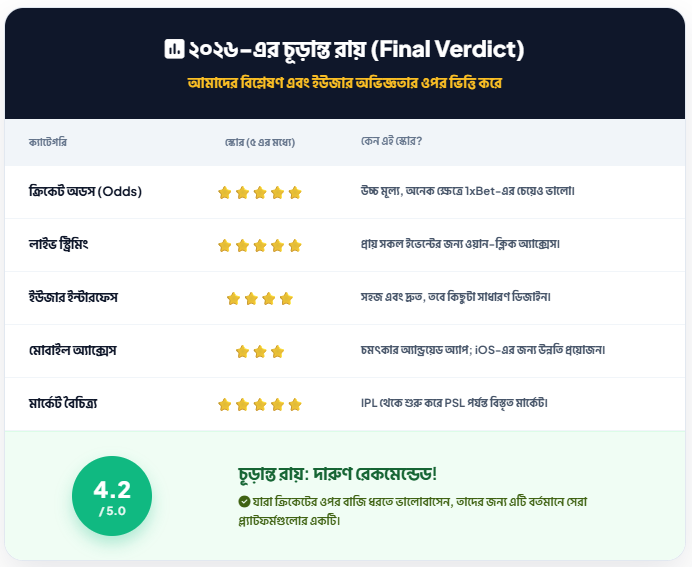 - প্রতিযোগিতামূলক অডস: ক্রিকেটের মতো বড় খেলাগুলোতে বাজারের সেরা অডস পাওয়ার সুযোগ।