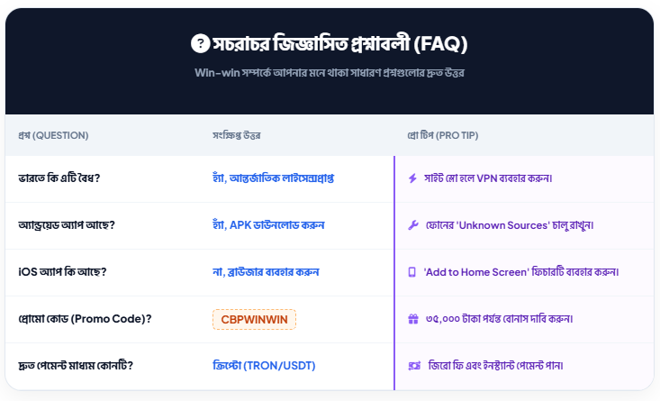 প্রশ্ন ১: ভারতে কি উইন-উইন (Win-win) বৈধ? হ্যাঁ, উইন-উইন একটি আন্তর্জাতিক লাইসেন্সপ্রাপ্ত প্ল্যাটফর্ম যা ভারতের বাইরের সার্ভার থেকে পরিচালিত হয়। বর্তমানে ভারতে এটি ব্যবহার করা সম্পূর্ণ বৈধ এবং নিরাপদ।